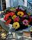 Целая охапка, созвездие лучистых гербер собраны в этом прекрасном, поистине праздничном букете. Тут и желтые, и оранжевые, и розовые, и даже цвета фуксия герберы, которые очень достойно смотрятся в ансамбле с брунией, берграсом и пышной юбочкой из зеленого фетра.